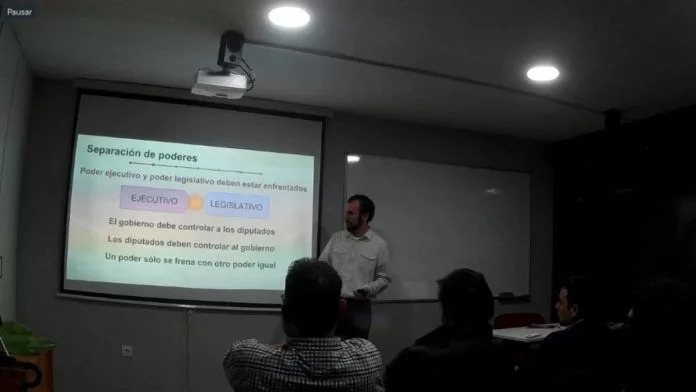 Puesto que no era una charla sobre el MCRC, una vez hechas las presentaciones pasamos a lo verdaderamente importante, que son los conceptos básicos de ciencia política. Dimos pinceladas sobre qué es la política y el poder, desmitificamos las ideas de democracia comúnmente asumidas por cualquier persona sin conocimiento de la materia y dedicamos bastante tiempo a uno de los temas más importantes: la separación Estado-Nación y la separación de poderes. Esto quedó reforzado mediante el caso práctico de España y nuestra no-constitución, de la que mostramos y criticamos diversos artículos. Seguidamente, hicimos un repaso del concepto de representación, los sistemas electorales mayoritario y proporcional, las consecuencias de cada uno y la demostración práctica de que no existe representación en España.