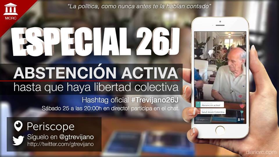 Este sábado, día que la ley electoral del régimen del 78 designa para la “reflexión”, vamos a emitir un programa especial desde los estudios de Somosaguas a las 20:00 por medio de la aplicación Periscope. Es necesario seguir a Antonio García-Trevijano en twitter y descargarse la app desde aquí. El hashtag o etiqueta a usar en la conversación es #Trevijano26J. Puedes participar en el chat y enviar preguntas que serán respondidas en directo y así resolver tus dudas sobre la abstención y la acción política para conquistar la democracia en España.