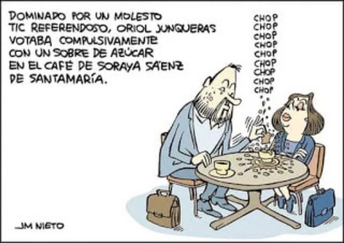 En una viñeta de ABC, “El tic de Oriol”, sienta Nieto en un velador a Oriol Junqueras pescando con un fartón en el café con leche de María Soraya, que viene de pronunciar una frase descomunal, y no sabe ella hasta qué punto: