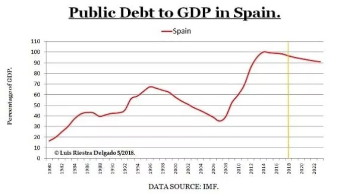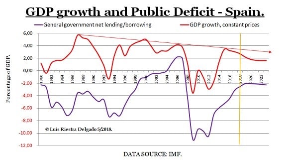Uno de los indicadores de gestión pública que considero más útiles es el ratio Deuda Pública respecto al PIB (gráfico de arriba); veracidades aparte, la previsión del FMI es imposible) pues, si los políticos gastan bien, dicho ratio no debería aumentar, ¿no? Ya se ve que el resultado es pésimo y se aproxima, de nuevo (lo estuvo en tiempos de Zapatero), a la “insostenibilidad”; de no ser por los acuerdos (supervisión, respaldo, control, etc.) con la UE, ya habríamos quebrado. Hubo un bajón del ratio, pero, como saben, fue falso y producto de la orgía inmobiliaria y expolio de cajas y particulares.