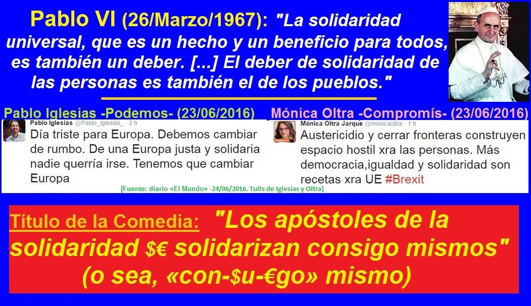 ¿De dónde y porqué la «solidaridad» en el artículo primero de la «Constitución» del «Gran Oriente de Francia», principal institución de la masonería francesa? ¿Por qué y de dónde la reiterada palabra «solidaridad» en el Programa del Partido «Podemos» para las «elecciones europeas» de 2014? ¿Por qué y de dónde la alusión a la «solidaridad» en boca del, al parecer, católico Joseph Bech (Primer Ministro luxemburgués y uno de los así llamados «Padres Fundadores» de la Unión €uropea), en su “discurso pronunciado con ocasión de la firma de los Tratados de Roma”(2) (25/Marzo/1957) ¿De dónde y por qué la cansina «solidaridad» esgrimida -23/Junio/2016- por Pablo Iglesias, jefe del citado Partido «Podemos», en defensa de la «U€» tras pronunciarse los ingleses a favor de salirse de ella?… ¿Por qué y de dónde tanta «solidaridad» …?